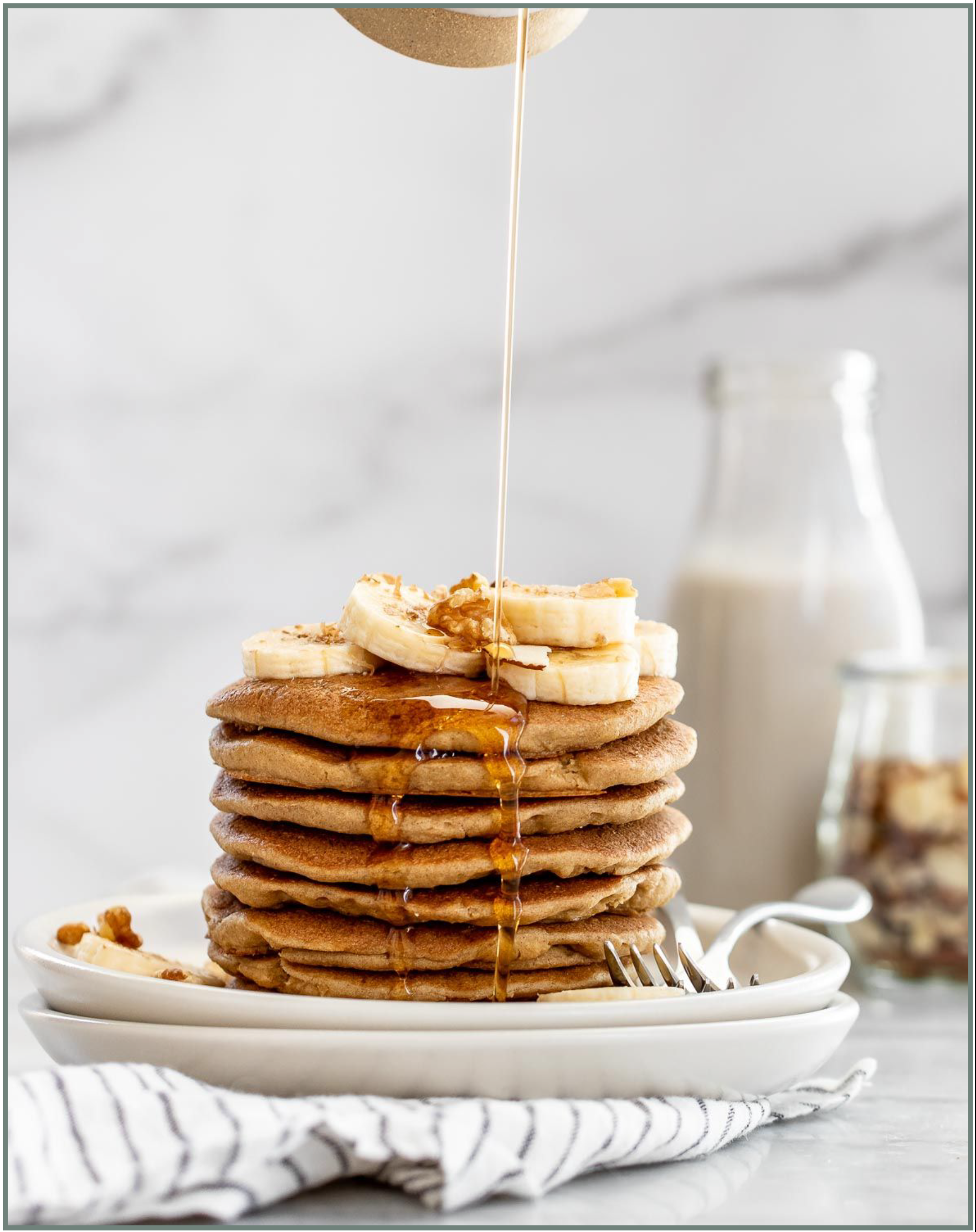 Mix dry and wet ingredients in separate bowls from each other. Add wet ingredients into dry ingredients. Mix well. Ladle batter onto warmed griddle or lightly greased pan. Cook until golden on both sides (I don’t recall seeing bubbles). Top with Maple syrup and your fruit and/or seed/nuts of choice. Enjoy!